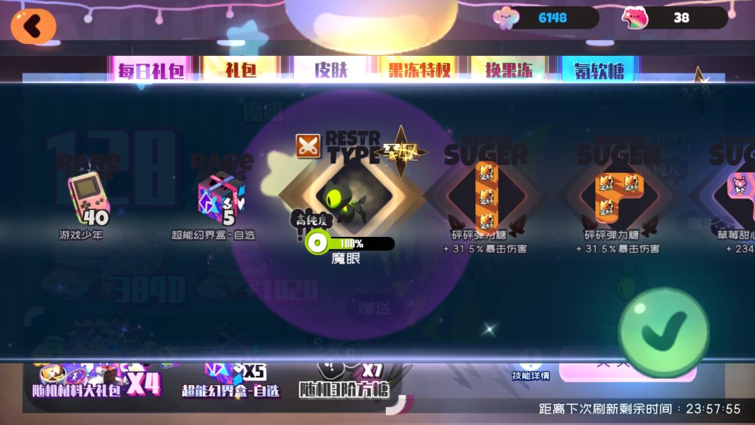 (素材本的刷新次数靠刷新票据来刷新,一个素材本最大挑战6次,第一次免费,剩下五次须购买2次副本重置包。一次副本重置包花费6软糖)
