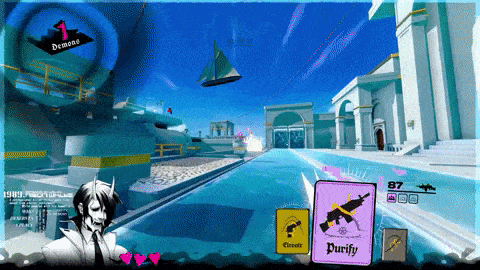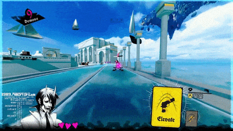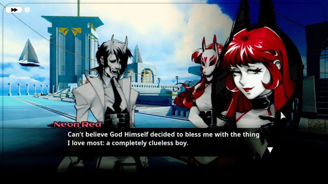 而且假如你喜欢《RWBY》《地狱客栈》这类受日漫影响的美式动画,那这游戏的人设可能也能戳中你。游戏的故事设定不算亮眼:你是个失忆的恶魔,在天堂苏醒,发现自己被卷入了一场在天堂清理恶魔的比赛,拿到比赛冠军,就能获得永久居住在天堂的资格。