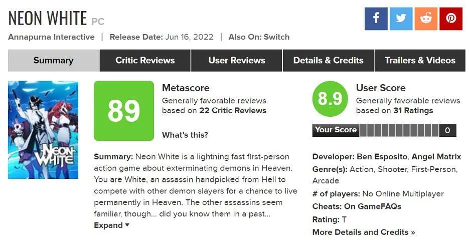 这游戏就叫《霓虹白客(Neon White)》。现在,它在steam上的好评率为98%,MC的媒体和玩家评分皆为8.9,且已经有数个游戏媒体和游戏UP将其称为今年的最佳独立游戏了。