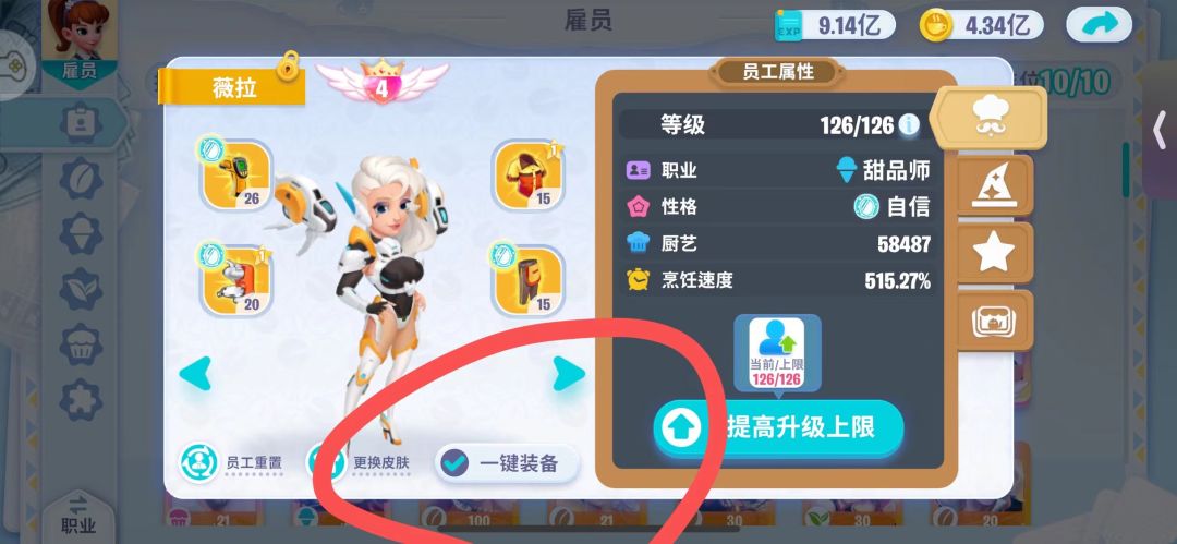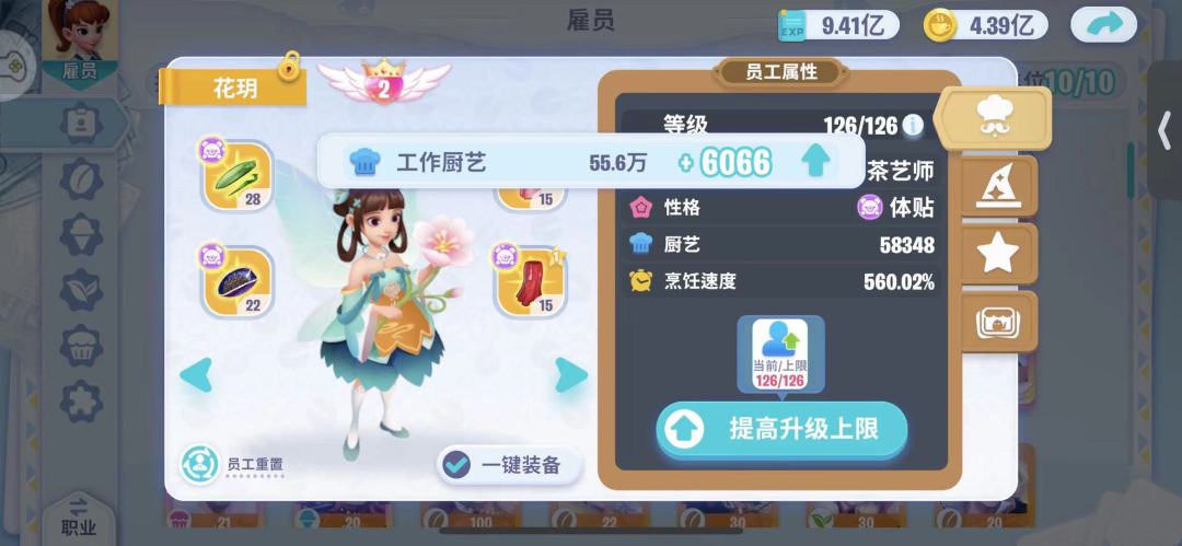 一键装备会优先把最匹配的装备给员工穿上,一键系统默认员工直接穿上可以获得最多厨艺值的装备。