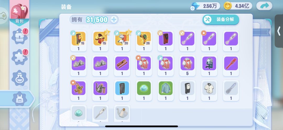 3.装备分解装备栏可以储存的上限是500件,如果装备栏到达上限值可以点【装备分解】。