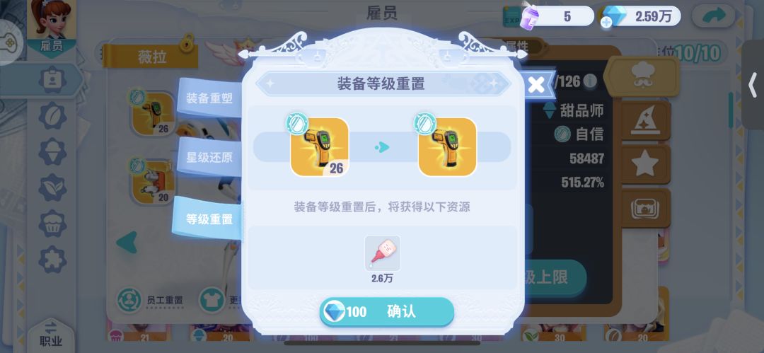 消耗100钻石可以给升过级的装备进行重置等级,直接返还升级过程中使用的全部胶水(包括吞的装备也默认以胶水返还,和装备分解的胶水数量一样)。
