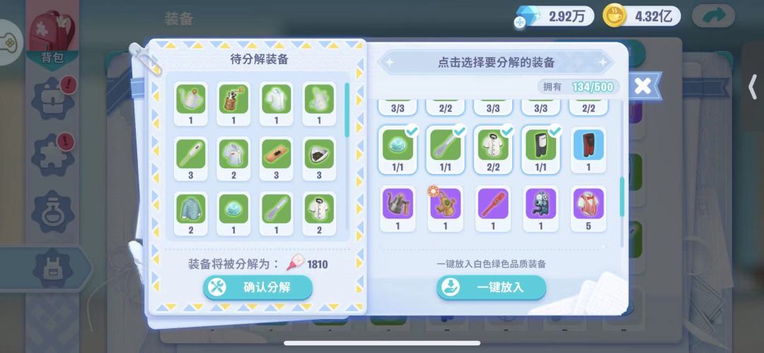 一键放入可以自动放入背包里的白色绿色品质装备,分解后可以获得装备品质相应的胶水数量。