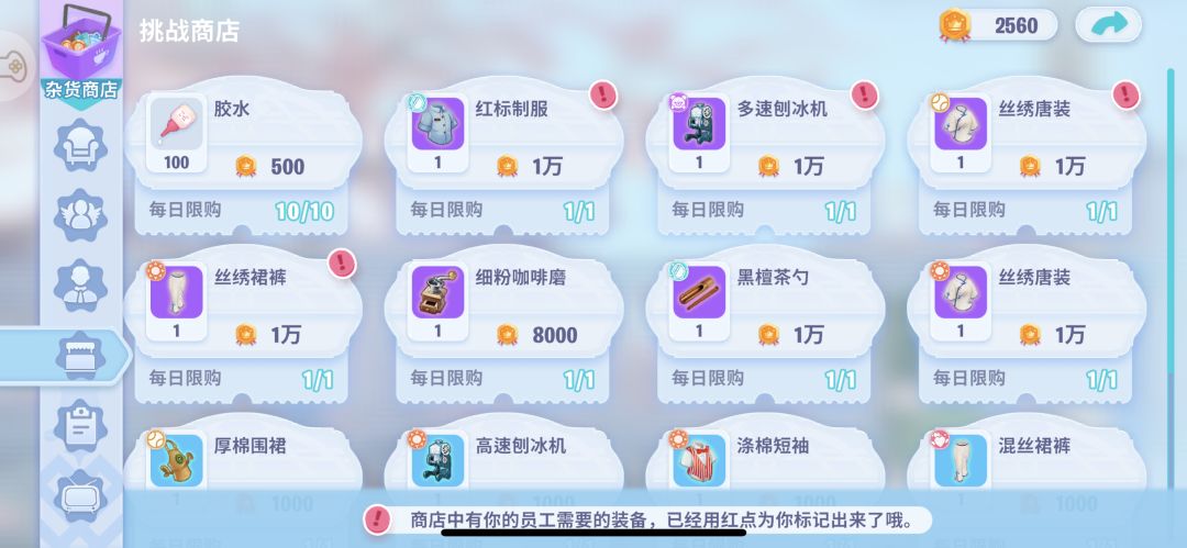 建议新手时期,员工的紫装还没有齐的时候,每天至少花费150钻购买两次挑战次数(柚子前期是每天买满的),是前期重要的装备来源,尤其前期装备给员工增加的厨艺非常可观。