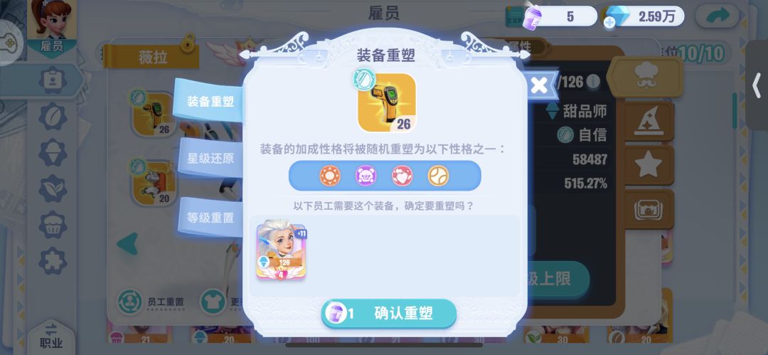 重塑性格是随机的,有可能喷一次就直接喷成你需要的性格,也有可能喷十几次都喷不到。(玄学:给装备喷性格可以丢背包里喷,或者把装备穿在你不想要的性格员工上去喷,说不定一次就能喷中你想要的性格。和抽卡一样,多少有点那什么...... 柚子挠头.gif)