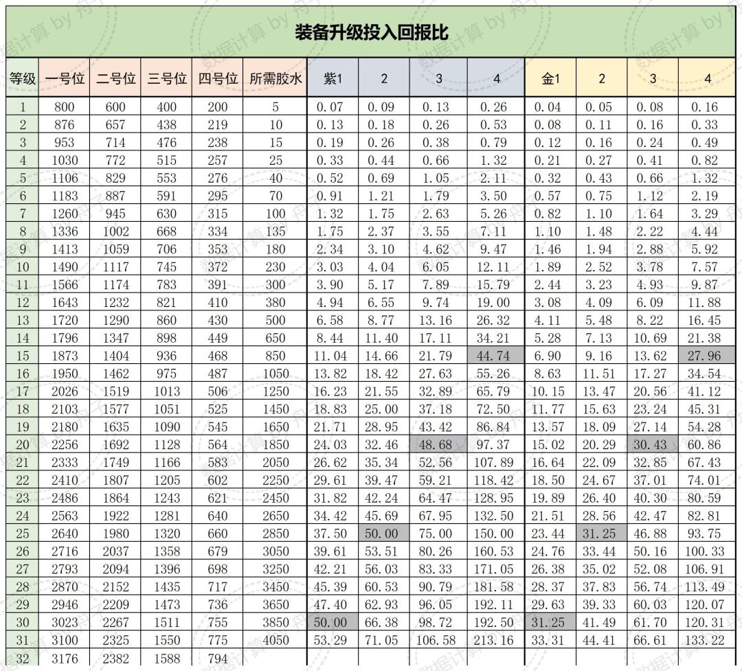 表格主要看后面的紫色装备和金色装备的投入回报比率,数字越大,投入回报比越低。