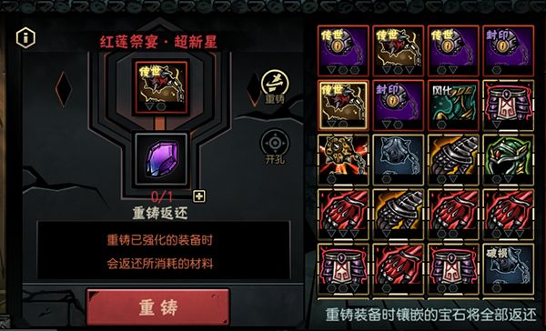 可从铁匠铺“装备洗练”页签进入,使用“重铸石”重铸装备属性及宝石孔,使用“宝石孔重置石”重置装备宝石孔