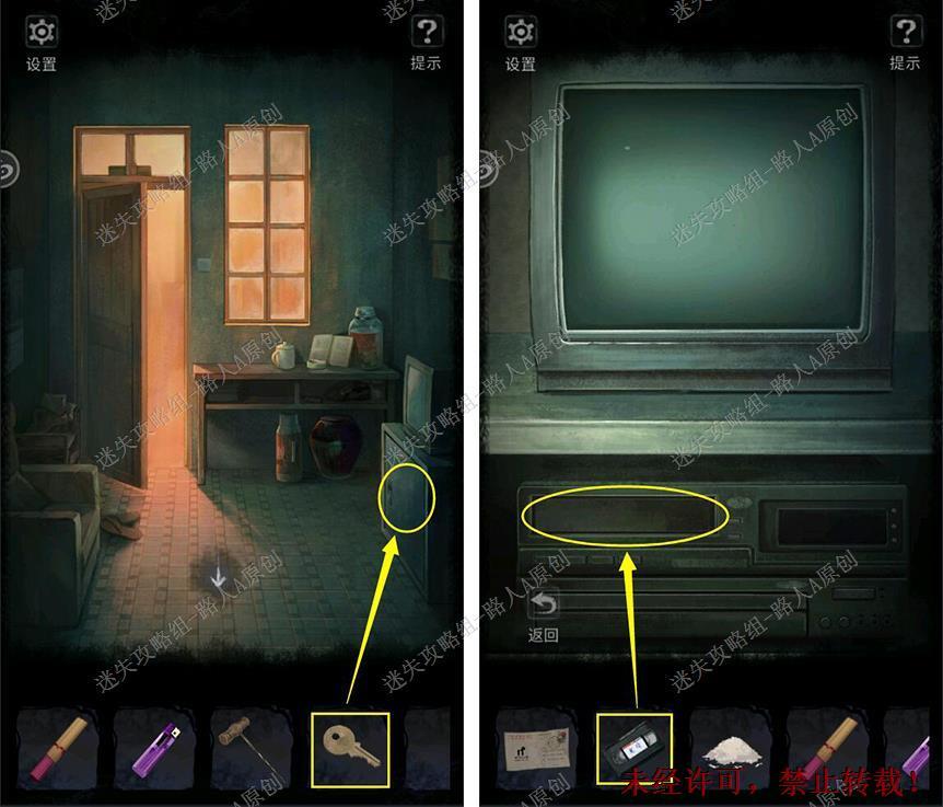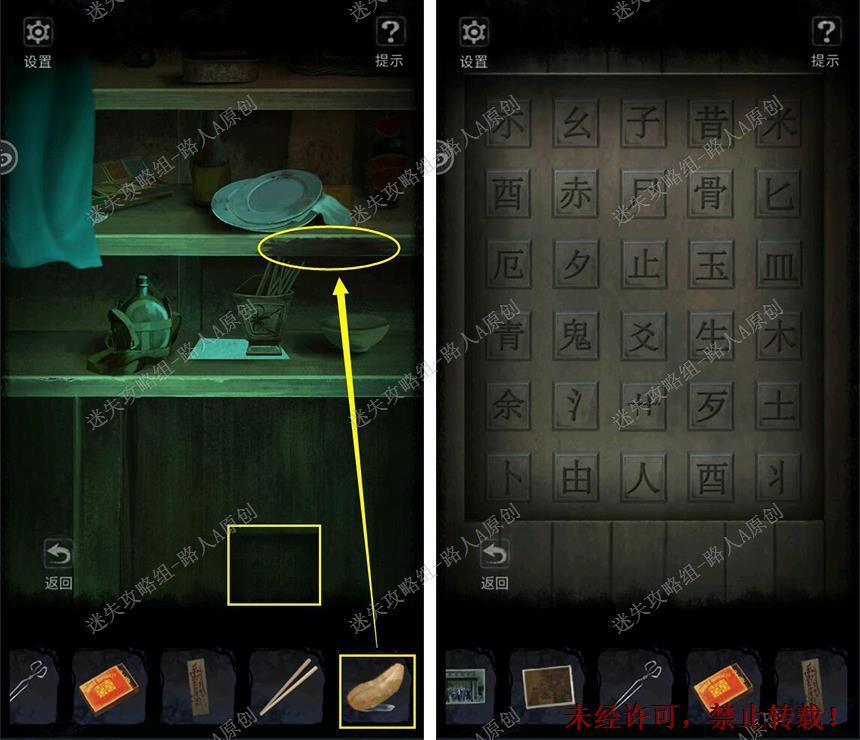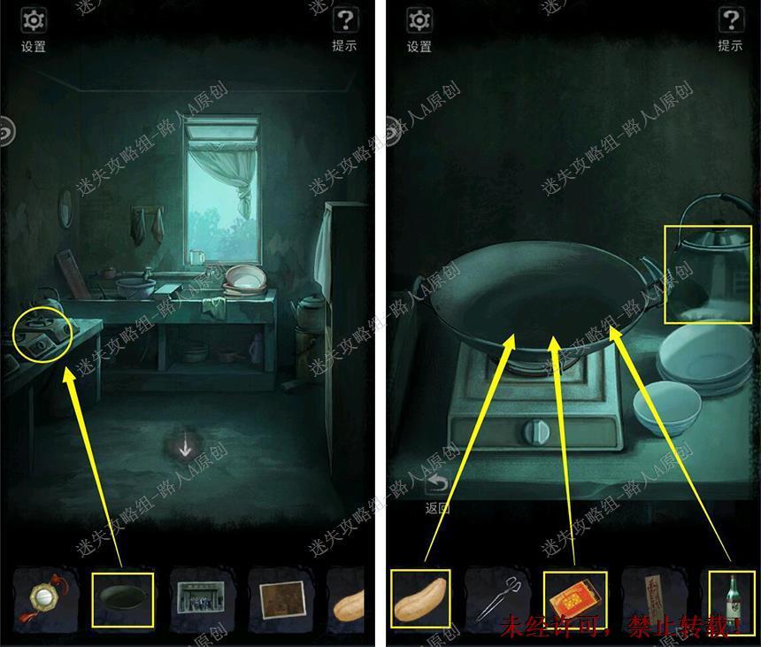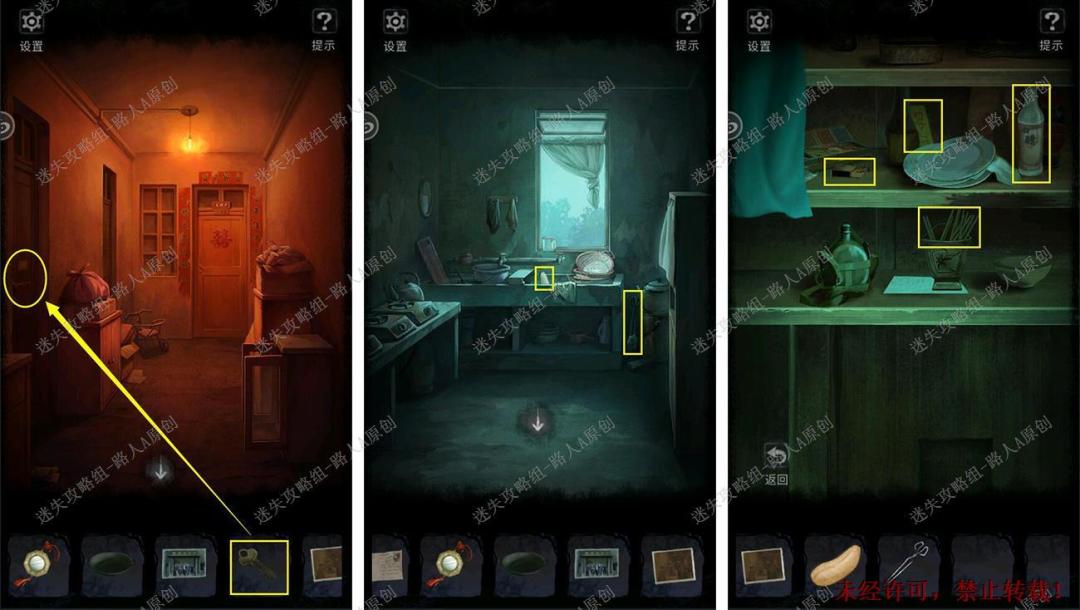 5. 用【钥匙】开门,进入厨房,拾取【丝瓜瓤】、【煤钳】、【火柴】、【黄符】、【白醋】、【筷子】。20.1
