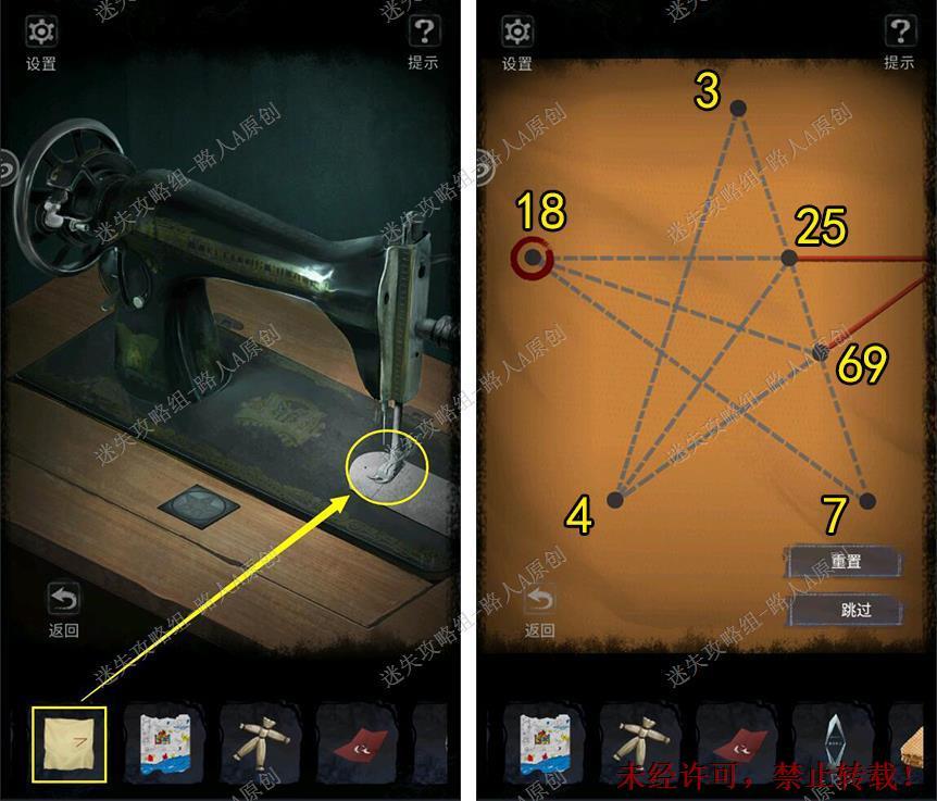 29. 返回卧室,对缝纫机使用【黄色的布】,完成一笔画小游戏,得到【有图案的布】。44.1