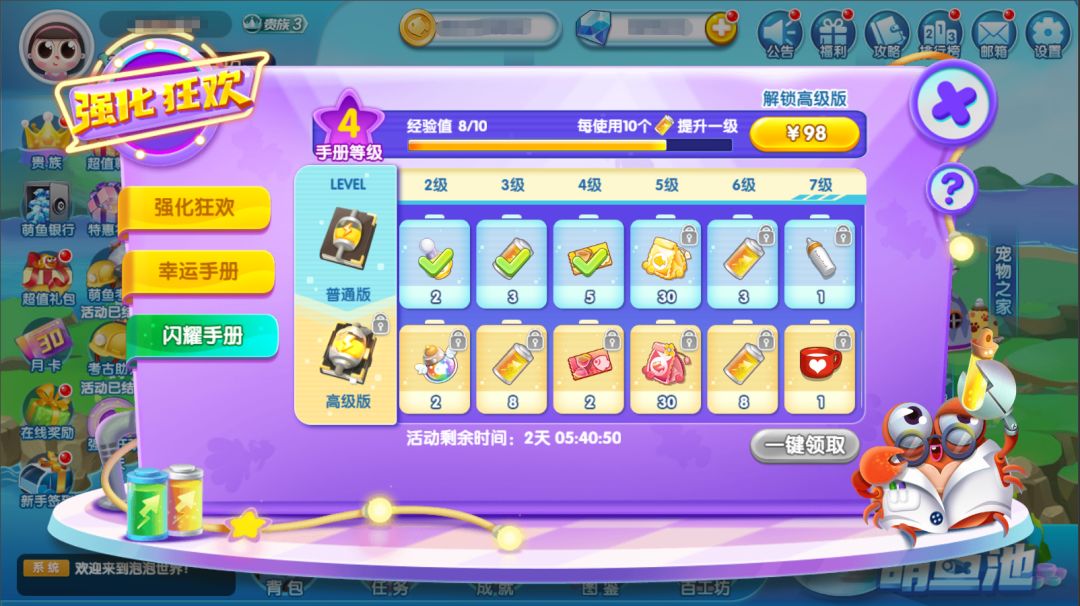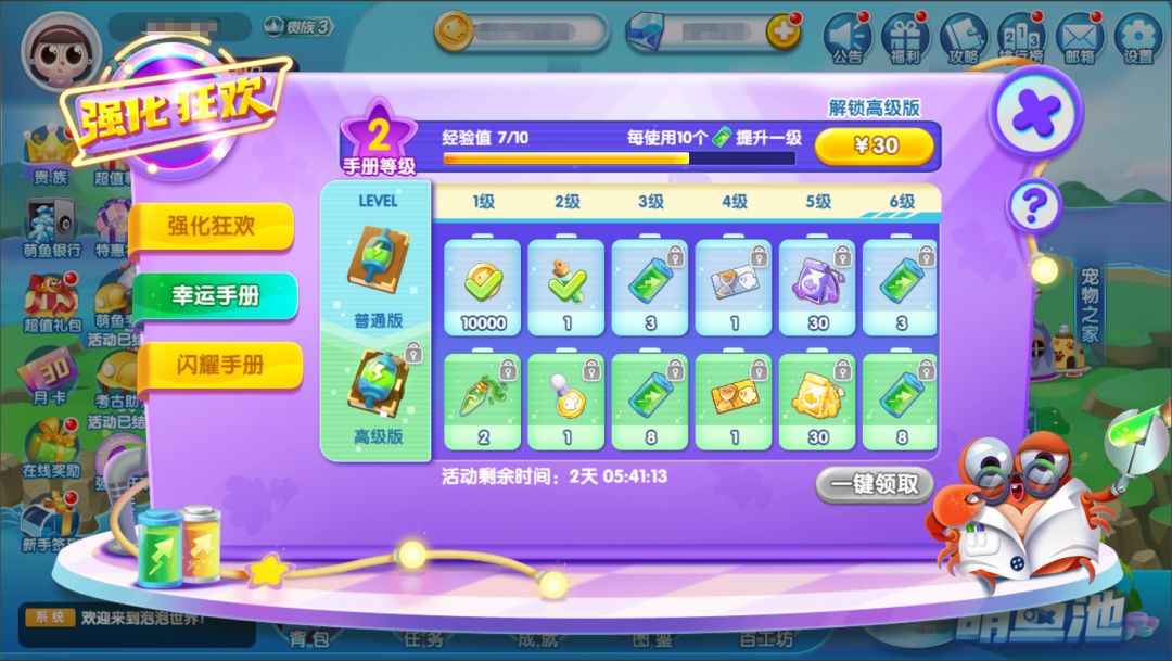 馆长每使用10个幸运电池,幸运手册将提升1级(最高等级为100级),电池消耗越多等级越高,同时奖励也会更多~另外解锁高级版手册还可以领取多一份对应奖励哟!
