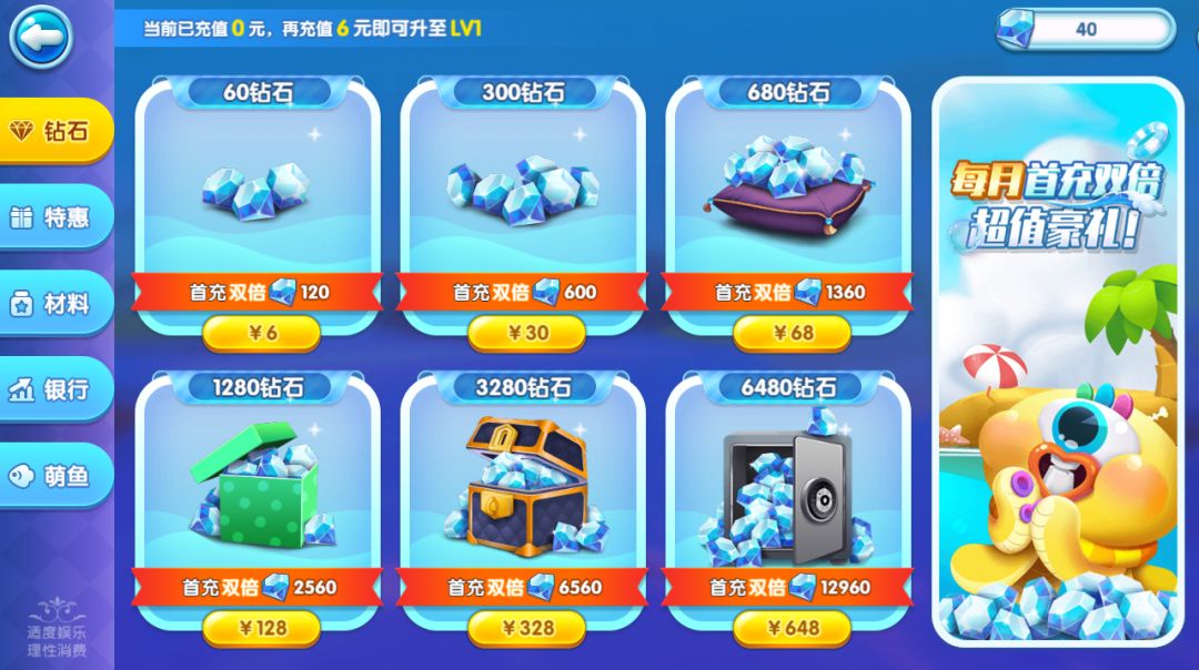 每档钻石礼包每月1日重置