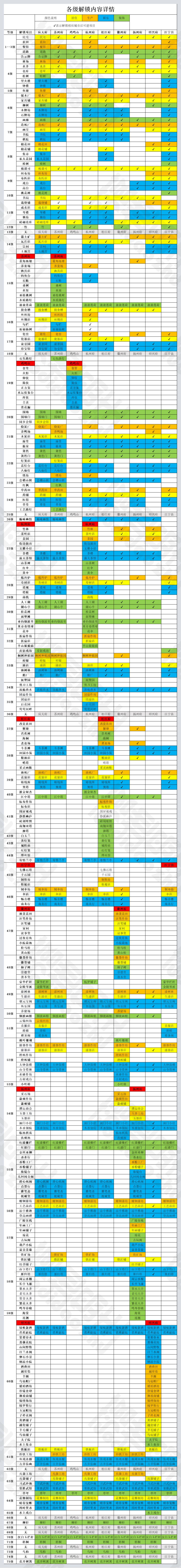 下图的表格把所有的解锁项目,都列了出来。老字号建筑解锁等级可能不准,数据庞大统计若有失误,欢迎大家指正。