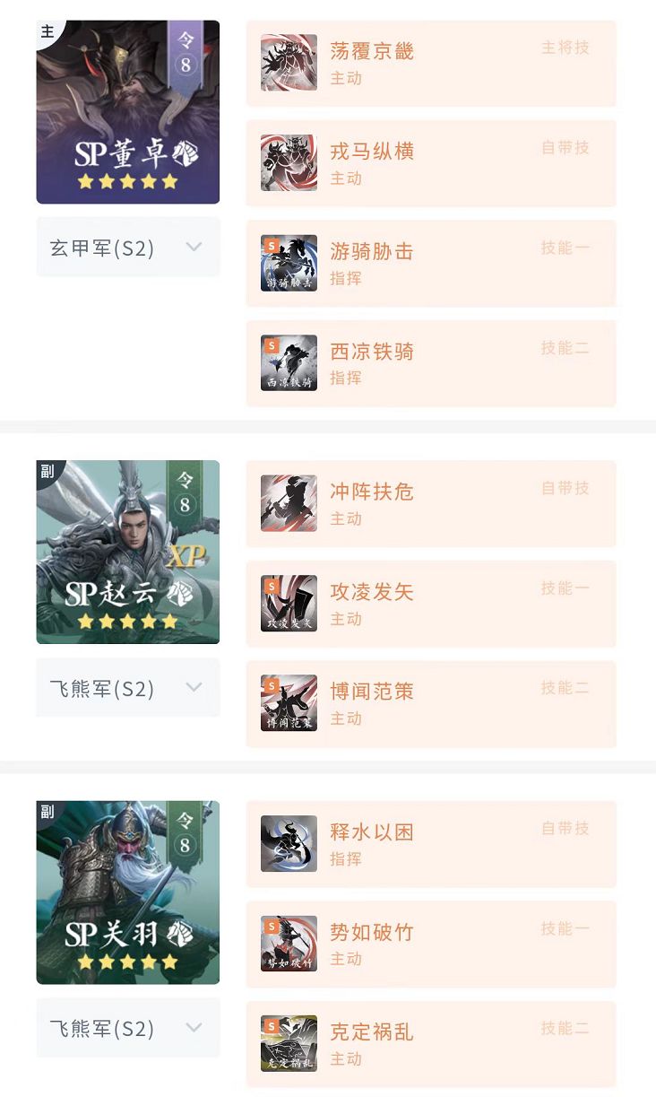 推荐站位方式:2(SP赵云)3(SP关羽)6(SP董卓)3(SP赵云)5(SP关羽)6(SP董卓)新蜀骑主要依靠削弱敌方防御来提升伤害收益,前中期敌方等级较低时能更快将防御清零,见效快收益高,后期满级满科技时减防效果会受一定影响。