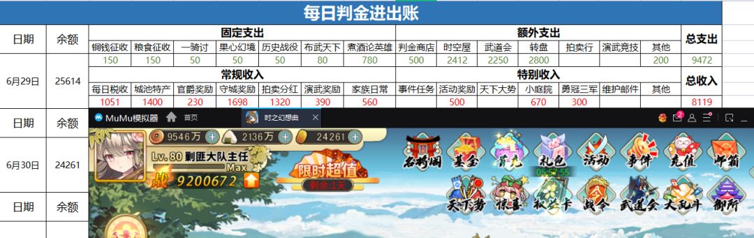 没有大活动,收入降低,但节约了点材料购买费用,总算收支平衡,为下赛季做准备