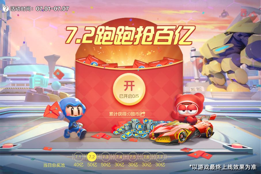 7月1日-7月7日,福利站将开启【抢百亿酷币】活动,活动期间,每日共有5次开启红包的机会,红包开启后将随机获得不同额度的酷币。另外每天开启红包时有概率额外获得拼手气红包,具体玩法规则请至游戏内浏览查询!参与活动可获得海量酷币,车友们不要错过喔~