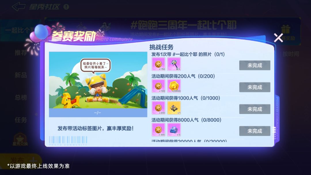 跑跑三周年,一起比个耶!6月30日起,车友们可以在星秀社区参与跑跑三周年-一起比个耶星秀摄影活动。发布带有#一起比个耶标签的照片,就有机会获得家园币、星秀点、燃擎之源手持、贴花礼包、小屋建筑等珍贵福利!一起来看看吧~