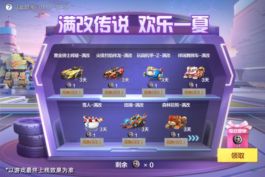 7月1日-7月7日,福利站将开启【满改传说车】活动,活动期间每日登录游戏即可获得赛车轮胎碎片,玩家可消耗指定数量的赛车轮胎碎片兑换满改传说车。活动结束后,赛车轮胎碎片将会被回收,请车友们注意活动时间~