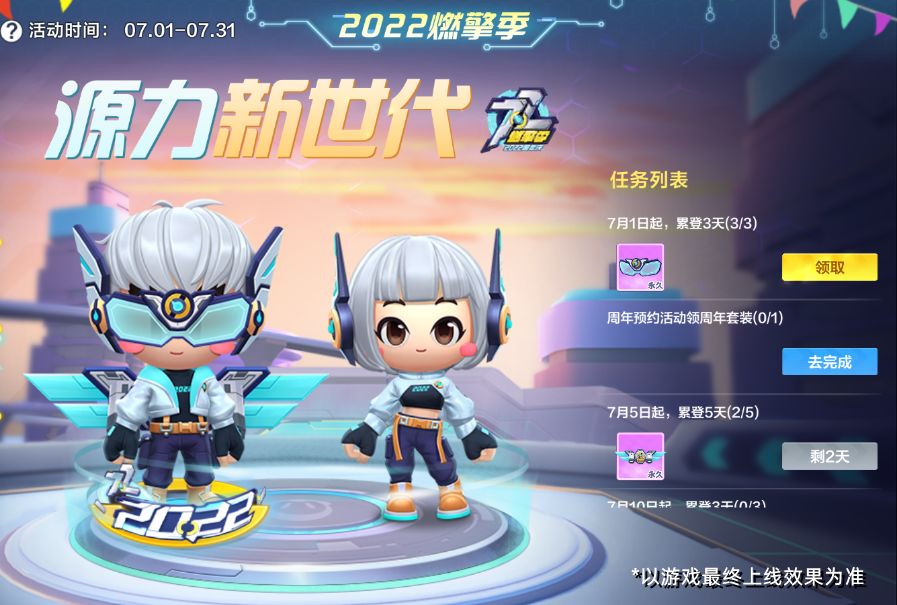 7月1日起,周年庆主题站将上线【源力新世代】活动,活动期间车友们从指定日期开始进行登录游戏,即可获得包括燃擎源力发型(女)、燃擎源力战服(女)、燃擎之源面饰、燃擎之源背饰、燃擎之源炫光等丰厚奖励~