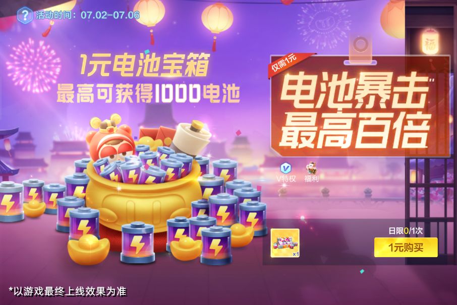 7月2日-7月6日,福利站将限时开启1元电池暴击活动,活动期间每日可直购1次1元电池宝箱,开启宝箱可随机获得电池,最高可获得1000电池哦~直购金额自动计入V积分,并支持激活招财猫和进宝猫。