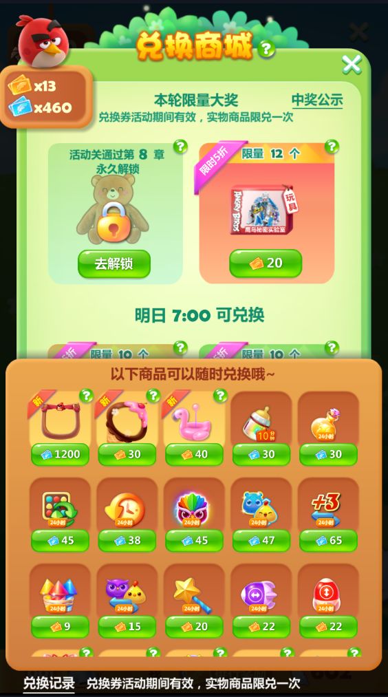 兑换商城再次升级!除常规道具兑换,新增限量小鸟周边玩具!更有全新头像框、关卡花,限量周边!兑换商城每日7:00、13:00、19:00刷新,越早兑换,价格越低,千万不要错过啦!