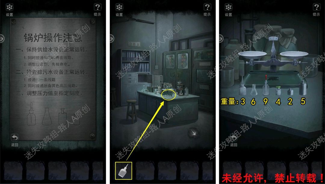 62.前往分析室,将【空油瓶】放到桌上,根据锅炉操作说明和天平称重,得到密码【9654】。62.1