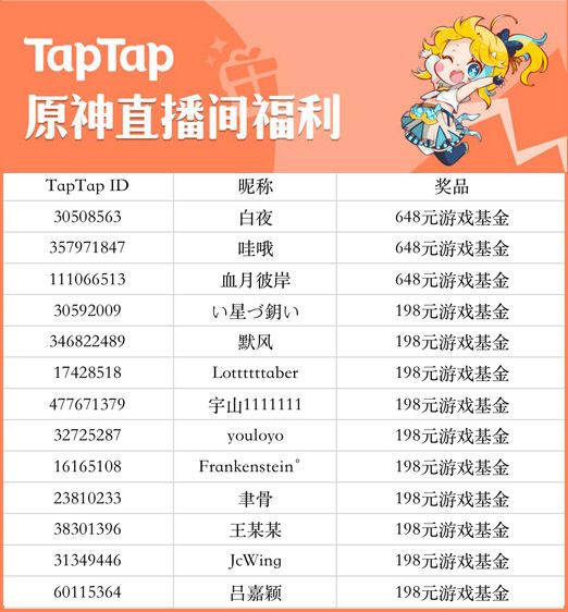 本帖已经开奖!我们从在直播间发送“十连出金,契约已成”的玩家中,随机抽出以下 13 位,送出「648元游戏基金」或「198元游戏基金」。