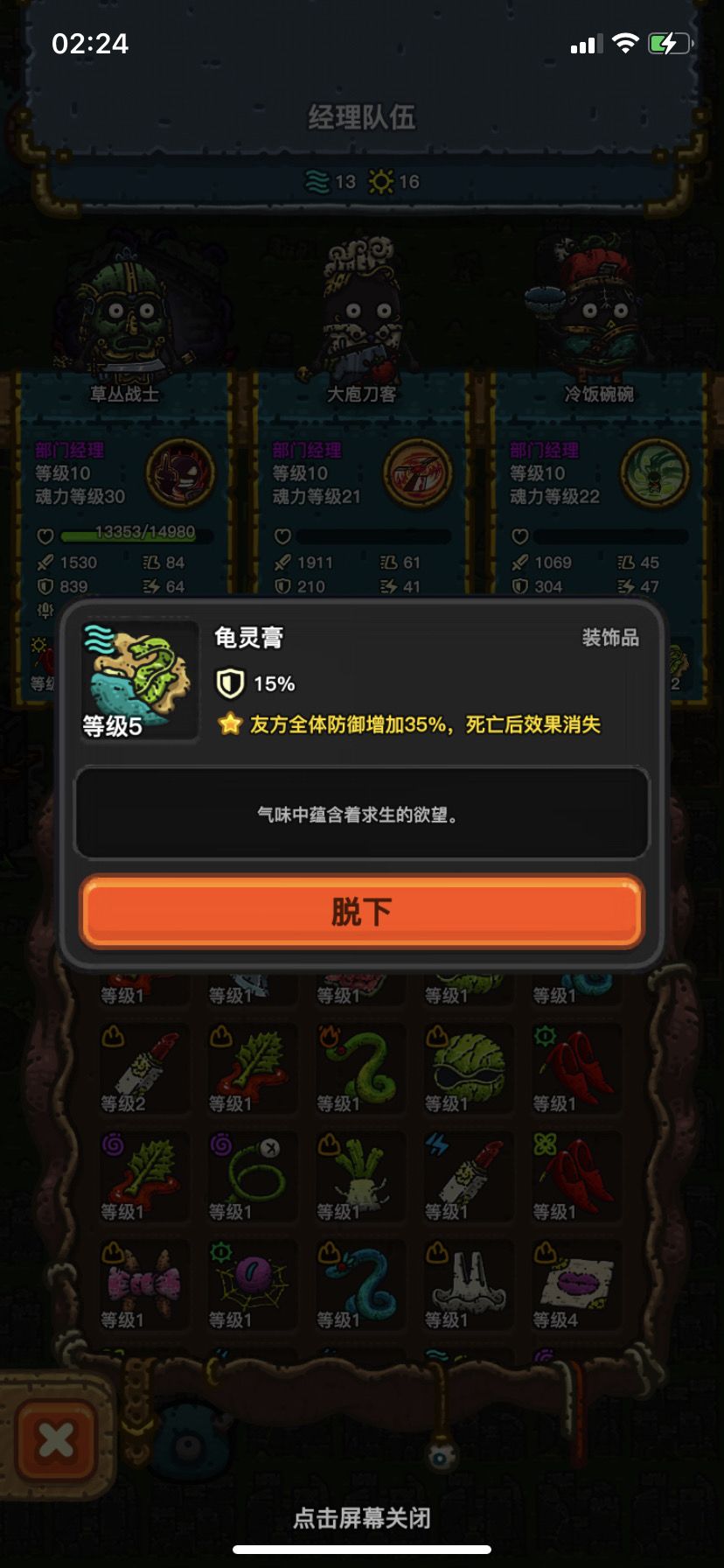 拿装备的原则就是,元素光,水的拿,属性加血加防的拿,其他的pass,不过有些特殊装饰品自带技能的,可以留一下,说不定就发挥作用了呢。(龟苓膏有更好的替代——口红,防御属性的收益没有血量收益高。手帕也可以换个血量加成多的,毕竟回能属性其实没有那么多重要,有个25%血量加成的,叫啥我忘了,爆出来的时间太晚了)