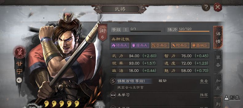 三国志战略版甘宁怎么获取?三国志战略版甘宁战法怎么搭配?在游戏中,甘宁的自带战法锦帆百翎还原了甘宁果敢暴躁的性格,赋予了甘宁强大的暴击能力,能够最大化的放大来自队友的加成,本期小楼就来给各位小伙伴们分享一下甘宁的战法,一起来看看吧。