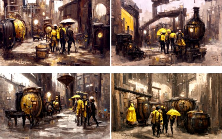 "A beautiful painting of a steampunk alley, four people, trade, night, rain, railway, coal, fire, factory, Wine barrels,Industrial Revolution, Trending on artstation.", "yellow color scheme"