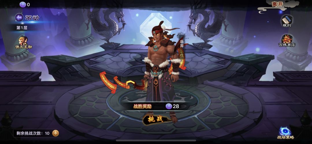 4.玩家每天可获得10次挑战次数,每次挑战失败将扣除挑战次数;花费元宝可购买挑战次数