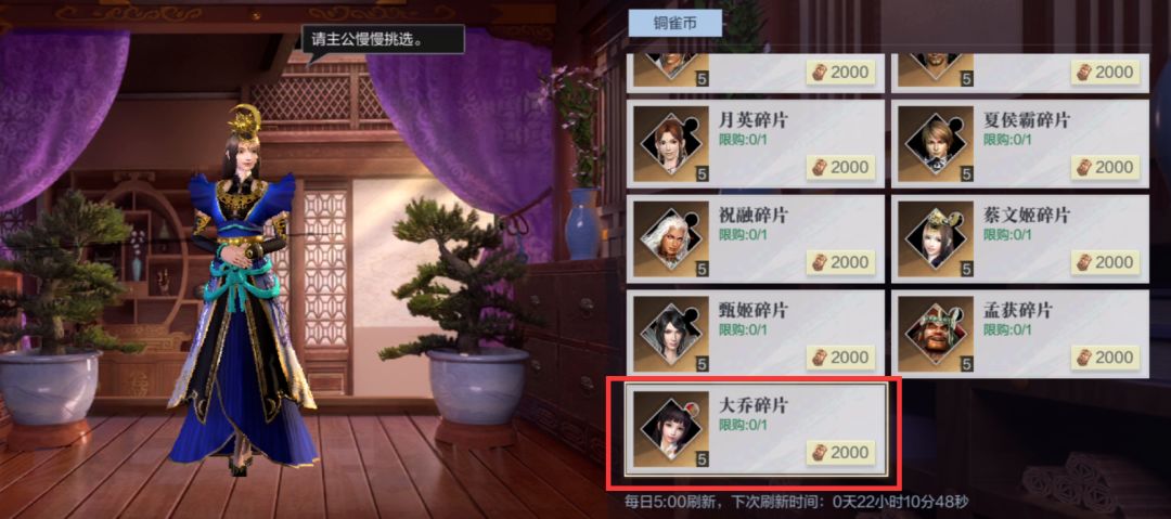 除了可以在武将招募中获得大乔之外,小霸王们还可以在铜雀商店兑换大乔的武将碎片,而每天一分钟不到即可完成的武宴摘星活动,就能快速积累铜雀币,各位心动的小霸王一定不要错过!