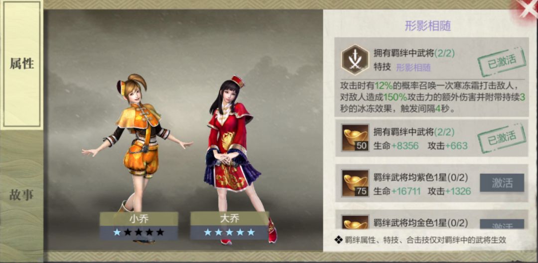 【明夜东风】大乔+周瑜:获得一定攻击和生命加成。