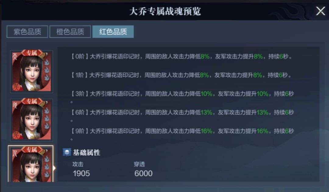 大乔的专属战魂以增益队友、削弱敌人为核心,大幅增强辅助能力。
