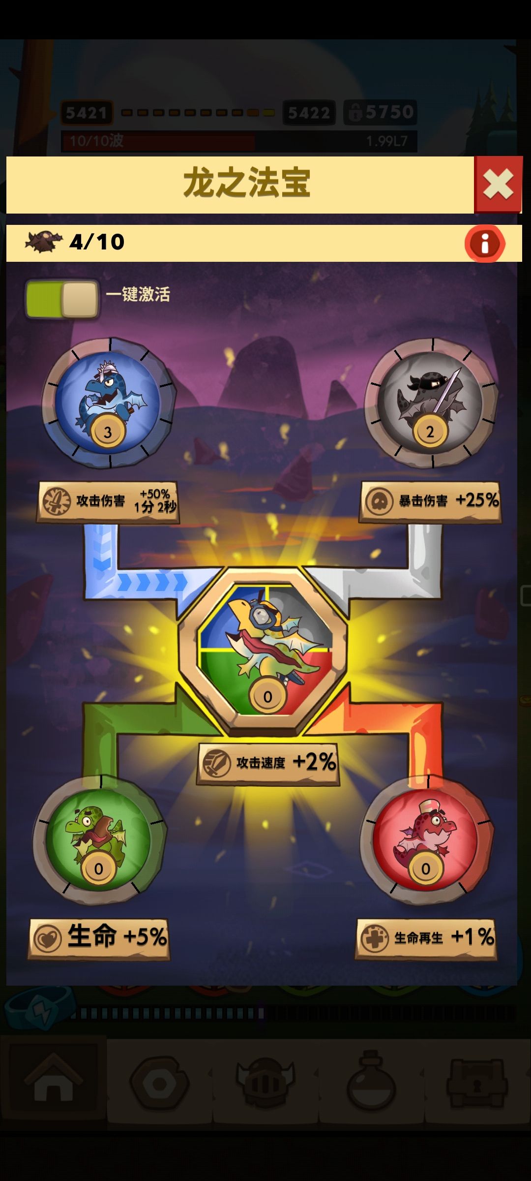 龙雕像用来激活四种不同的buff(如图),当四种buff同时激活时,会触发中间的加攻速buff,加攻速buff仅在4个buff同时触发时生效,切且等级与四种buff中等级最低的一致