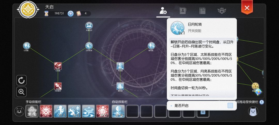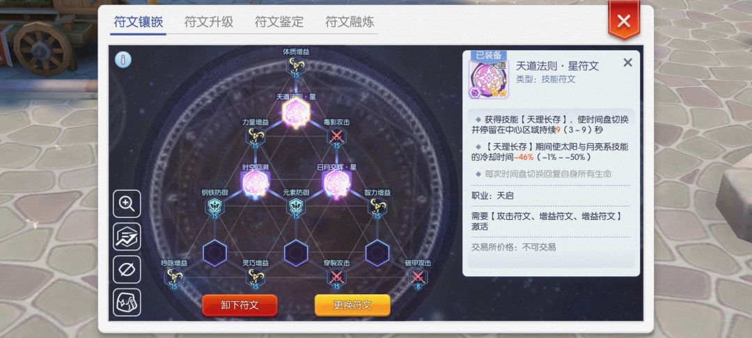 可以在使用后立刻切换日月盘,并且使指针立即指向中心,还能延长在中心停留的时间。因此日月流派非常依赖该符文的第一第二条,反而第三条不怎么需要,因为月亮盘的技能自带吸血,加上武器的技能吸血基本上打本都是满血。还有符文日月交辉