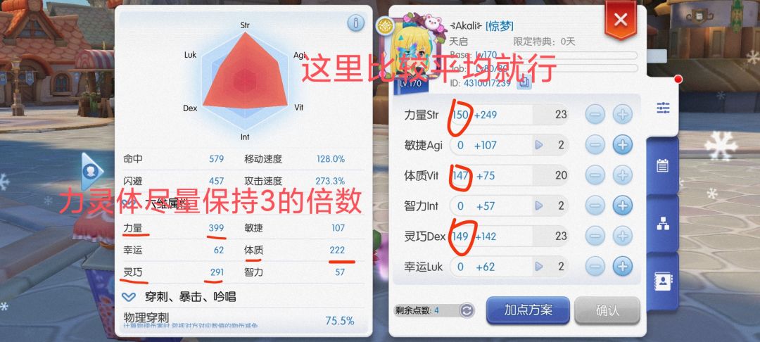 由于太阳爆炸和满月脚都能凭借灵巧力量体质增伤,所以素质点需要在让他们都是3的倍数的情况下尽可能的平均加点(虽然太阳爆炸文本描述为力量灵巧体质素质点同时增加3点的时候才会增加1%伤害,但是实测他的增伤机制是和满月脚一致的:每3点力量/灵巧/体质,伤害增加1%)