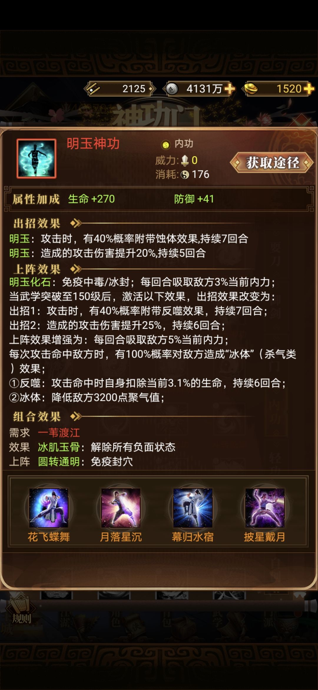 ①明玉套:明玉神功+一苇渡江