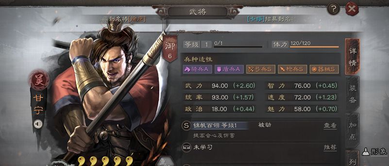 甘宁:推荐战法【破军威胜、横扫千军】推荐兵书【虚实、以治击乱、神机、鬼谋】