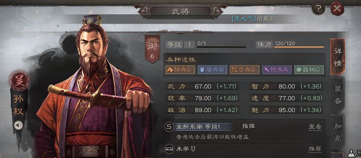 孙权:推荐战法【当锋催决、兵无常势】推荐兵书【作战、胜而益强、文韬、执锐】