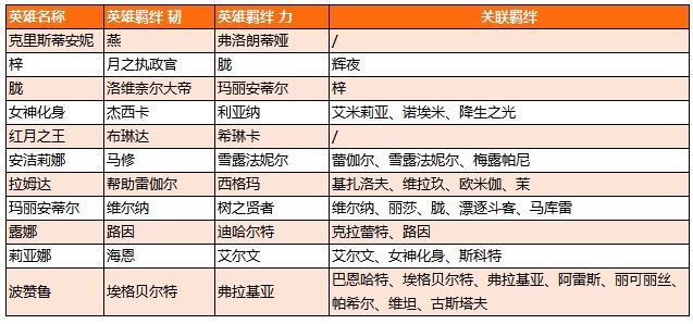 *帮助:需要该英雄帮助其他英雄完成对应羁绊关卡后,该英雄才会解锁对应羁绊。以拉姆达为例,在帮助蕾伽尔完成对应的羁绊关卡后,拉姆达的韧羁绊才可解锁。
