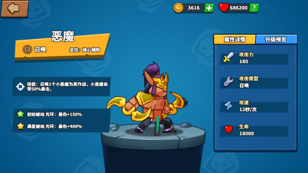 恶魔:召唤1个小恶魔为其作战,小恶魔自带50%暴击。初始被动光环:暴伤+150%
