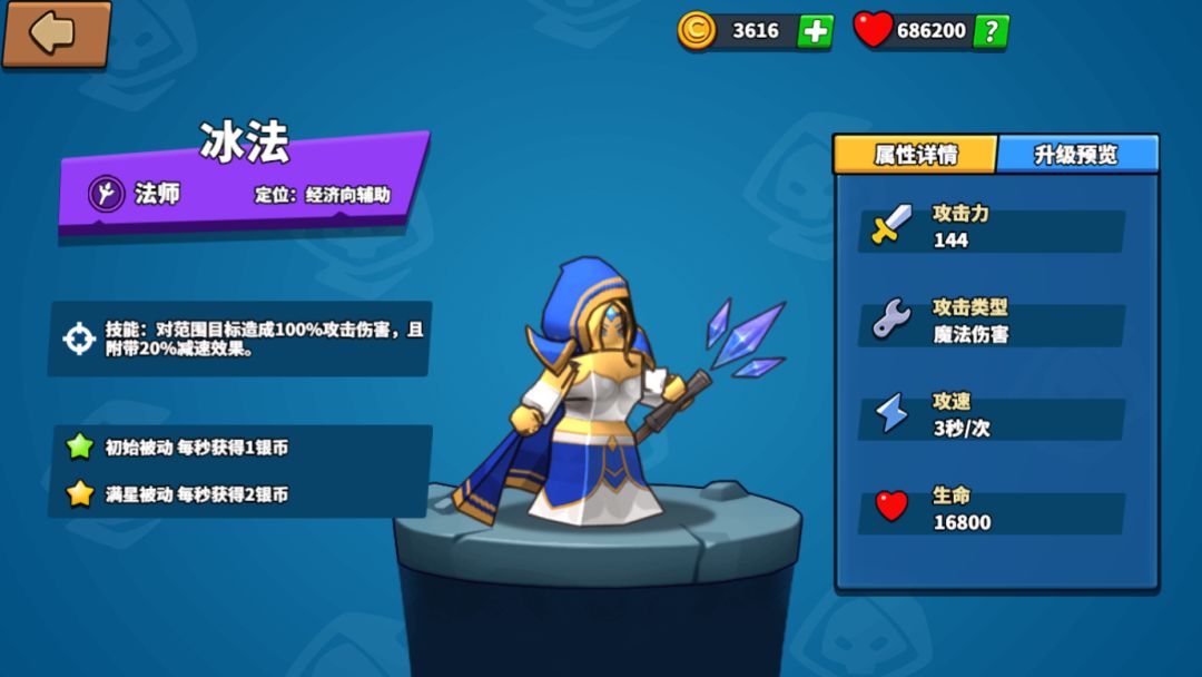冰法:对范围目标可造成100%的伤害,附带20%减速效果。每秒可以获取1个银币