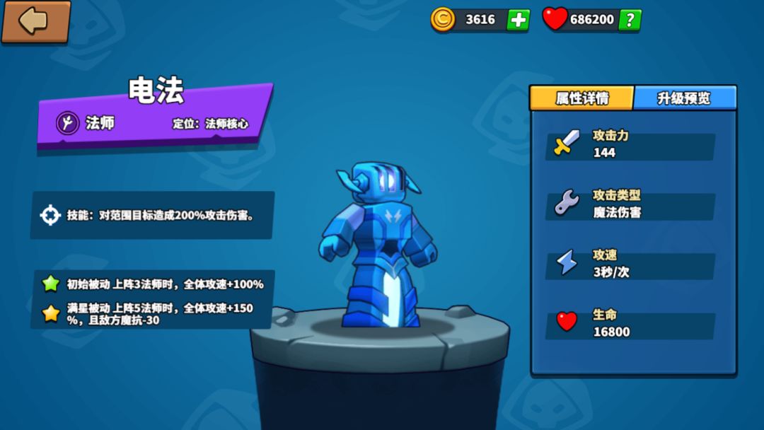 电法:对范围目标造成200%攻击伤害。上阵3法师时,全体攻速+100%