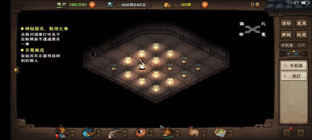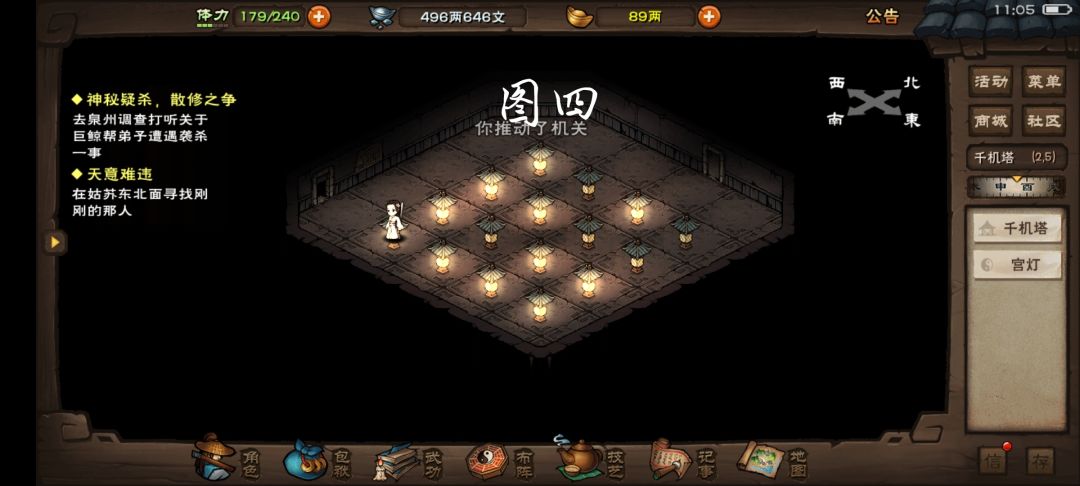 直接上伪万能公式:第一先将对角的一条宫灯点亮,及点亮(1.4)(2.3)(3.2)(4.1)。如图一。第二先把左下角点亮,如果你想点亮(1.3)你得通过点亮(1.2)才行,如图二,正常情况是可以全部点亮的,例外如图三,图四,解决办法如下:图三可以通过熄灭(2.2),点亮(1.1),点亮(3.3)变成图四。图四可以通过熄灭(3.2)(4.1),点亮(4.2)达成左下角点亮。需要注意的是就好不要动里面的格子,只动边缘的格子最好。