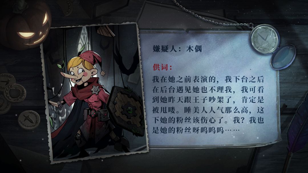 表面上一片祥和的剧院后台,私下却暗潮汹涌。木偶一直嫉妒睡美人的人气,明明只是当个花瓶,却拥有最响亮的掌声和高昂的报酬。这天在后台,小王子向睡美人求婚遭拒,恼羞成怒大吵了一架。路过的木偶目睹这一切,便趁睡美人休息时用木偶将睡美人敲死,擦拭血迹后将纸巾丢到垃圾箱,再将小王子的求婚戒指放到睡美人的梳妆台上伪装为情杀。所以,本案的凶手是木偶。