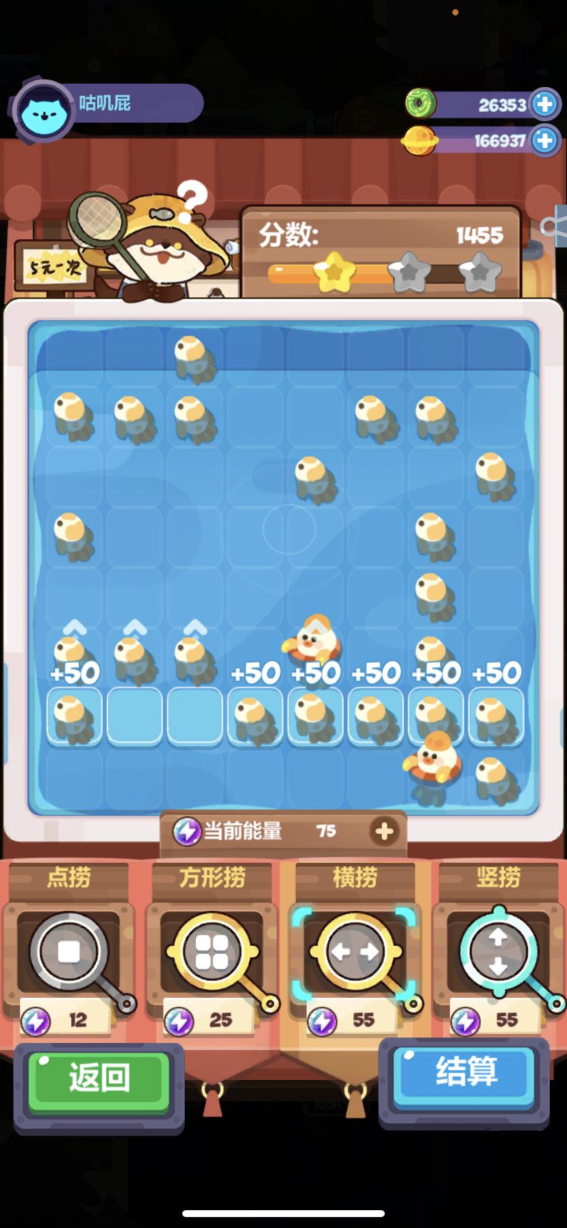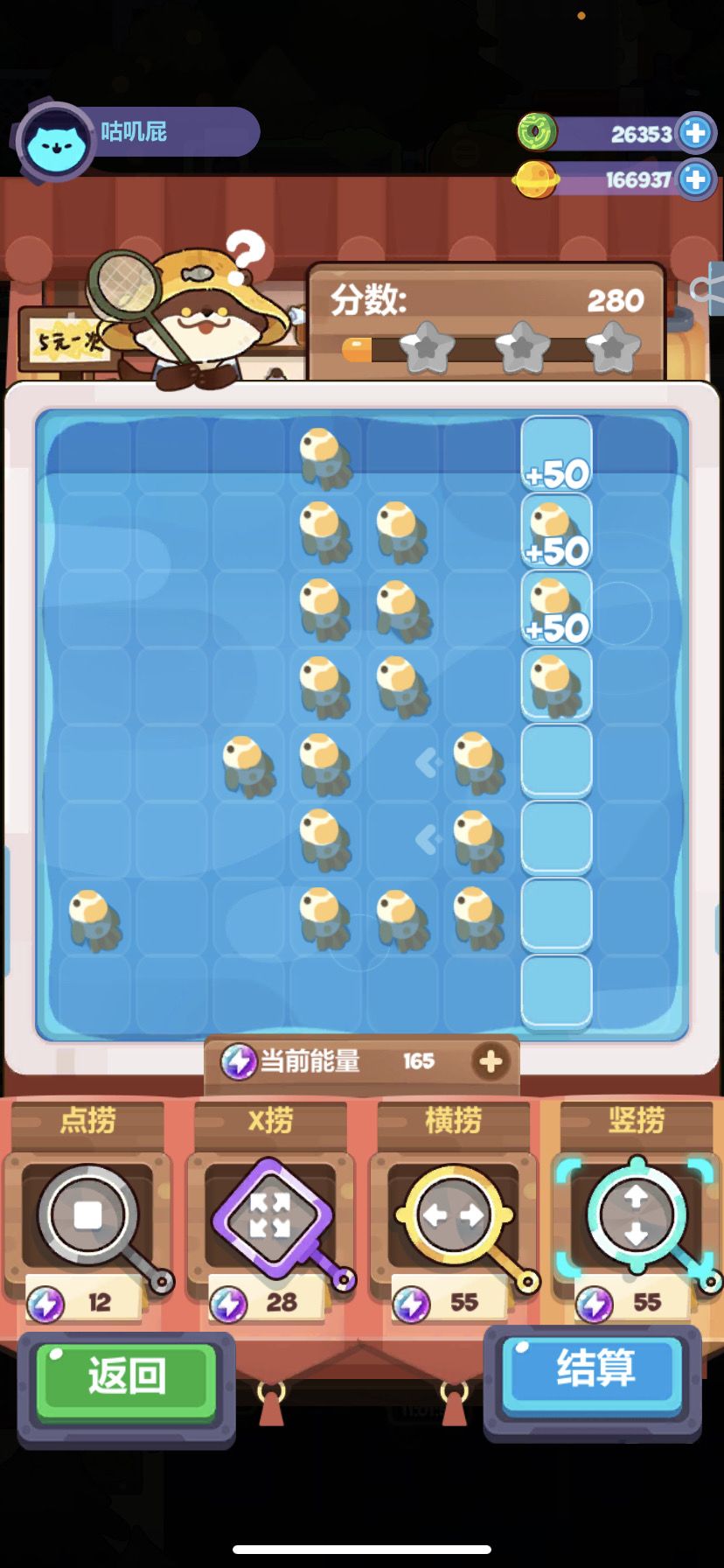 这样小鱼直接全被收掉,捞四次就满🌟过关!