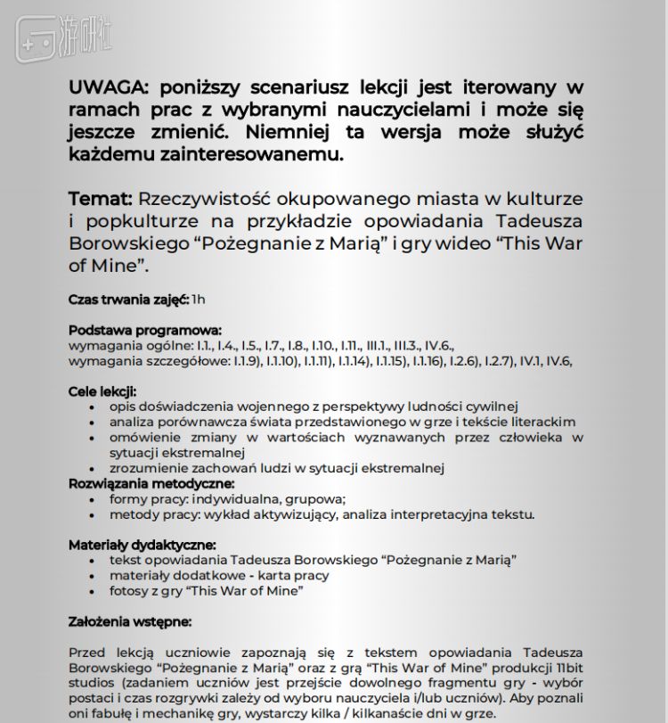 在游戏下载页面中,波兰政府还提供了与 11 Bit Studios一起合作推出的教案,其中给出了课题指导方向,旨在引导学生不要只图热闹、而是从细节中思考游戏传达的意义。