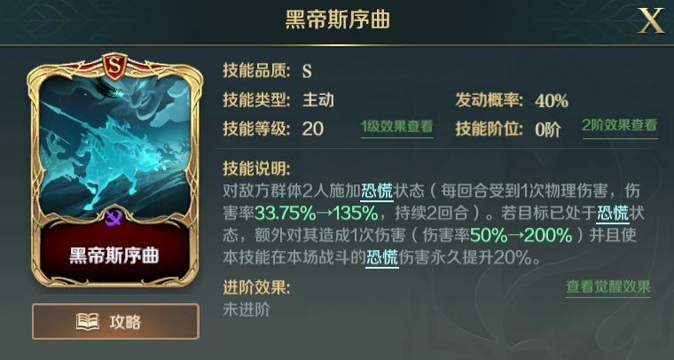 对敌方2人群体恐慌覆盖,每回合造成物理伤害,同时附加了已处于恐慌状态下额外伤害和永久伤害提升。