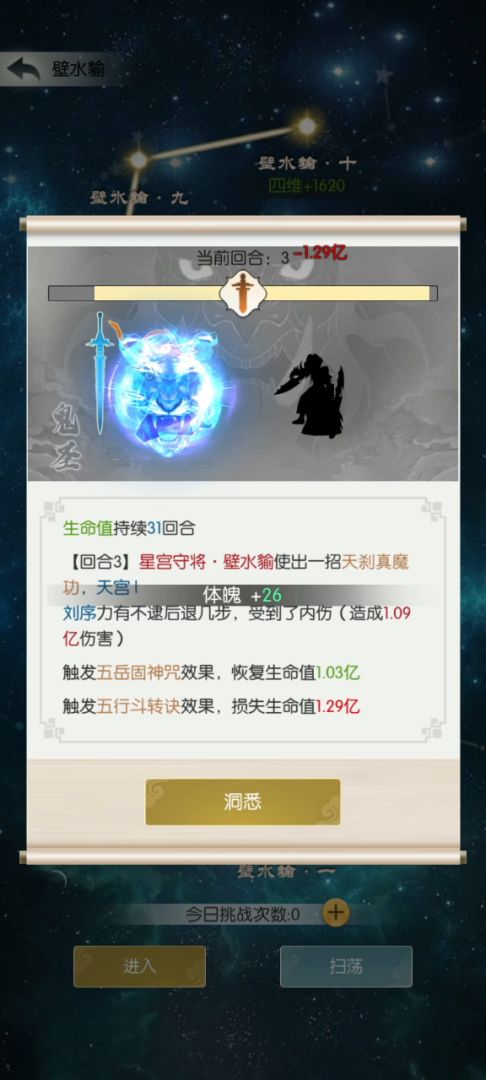 此外抗性也非常重要,除了自身五行抗性要高,五乾五灵等级尽量高点。特别是遇到杀神怪或者九阳怪,如果你不带鬼圣套真空期会被一刀秒(抗性低甚至带了也不一定抗的住一刀)下面是我星宫通关的战斗回放,因为通关时五乾五灵都只有10级,所以差点翻车。😶