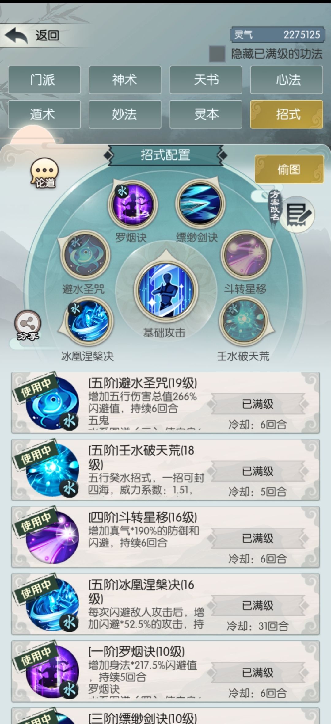 这里需要普及一个小知识,五斗伤害和五岳回复量取决于招式使用之前的总五行值(非面板),因此提高主五伤害(通过图谱加成,神通,灵兽招式,法则)可以有效提高五斗伤害和五岳回复。注意是使用招式之前,意思就是招式本身的图谱加成无效(例如五岳五斗都带图谱,五斗能吃到五岳的图谱加成但是吃不到自身的图谱加成)。